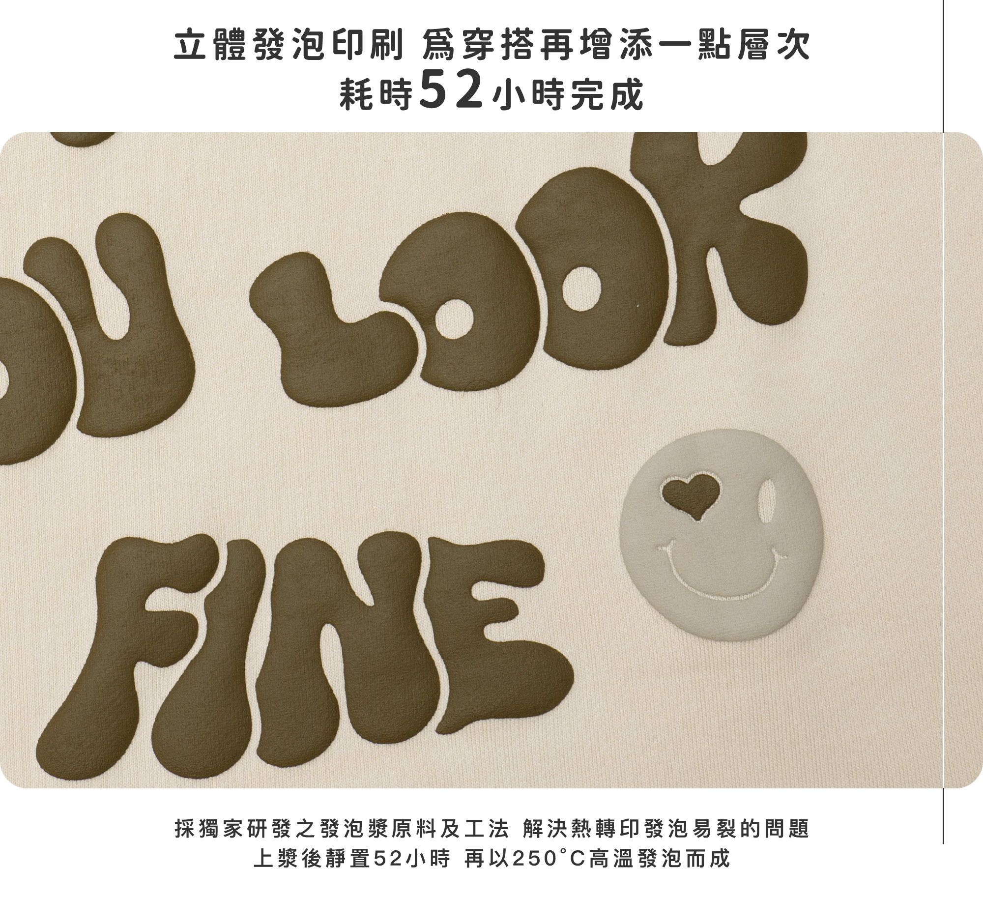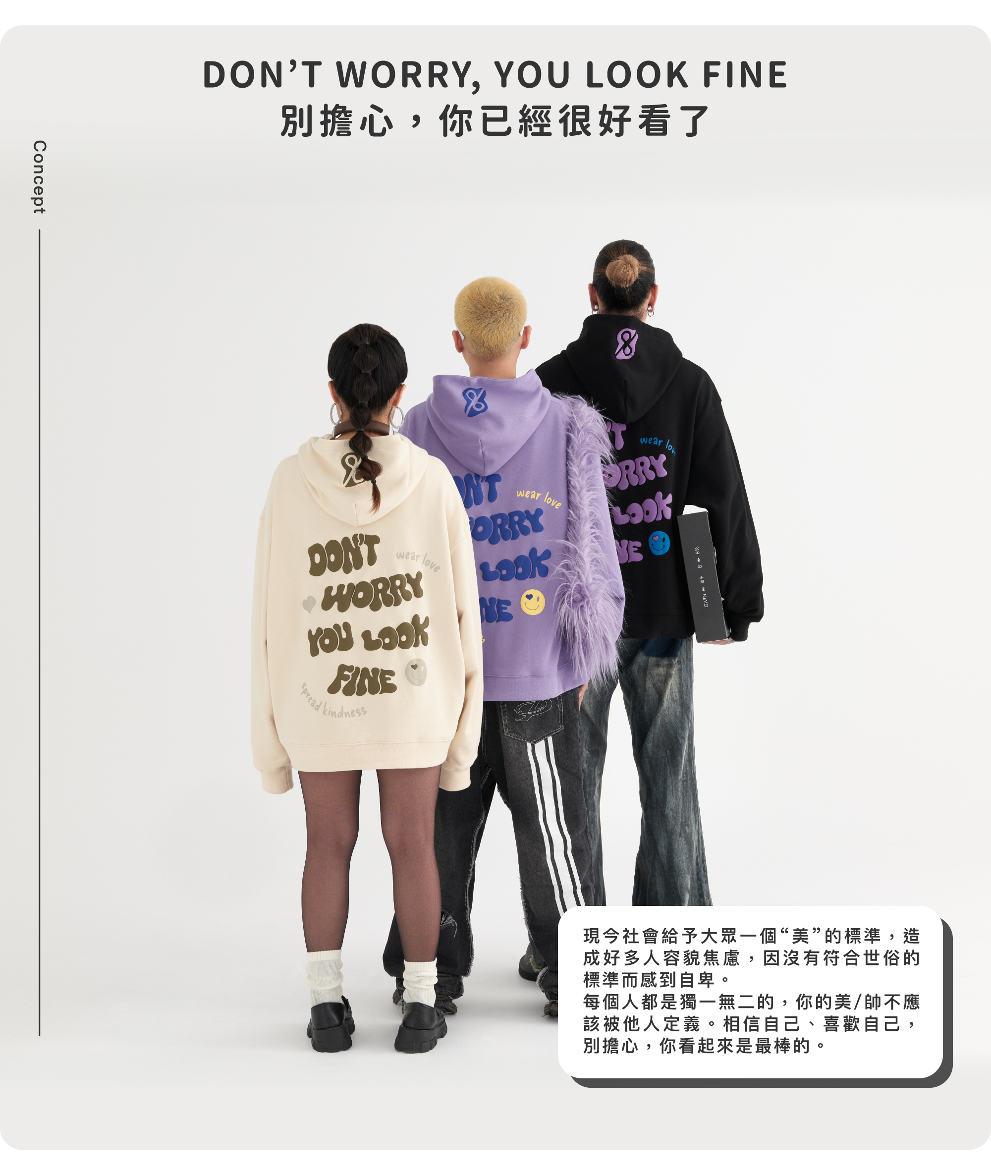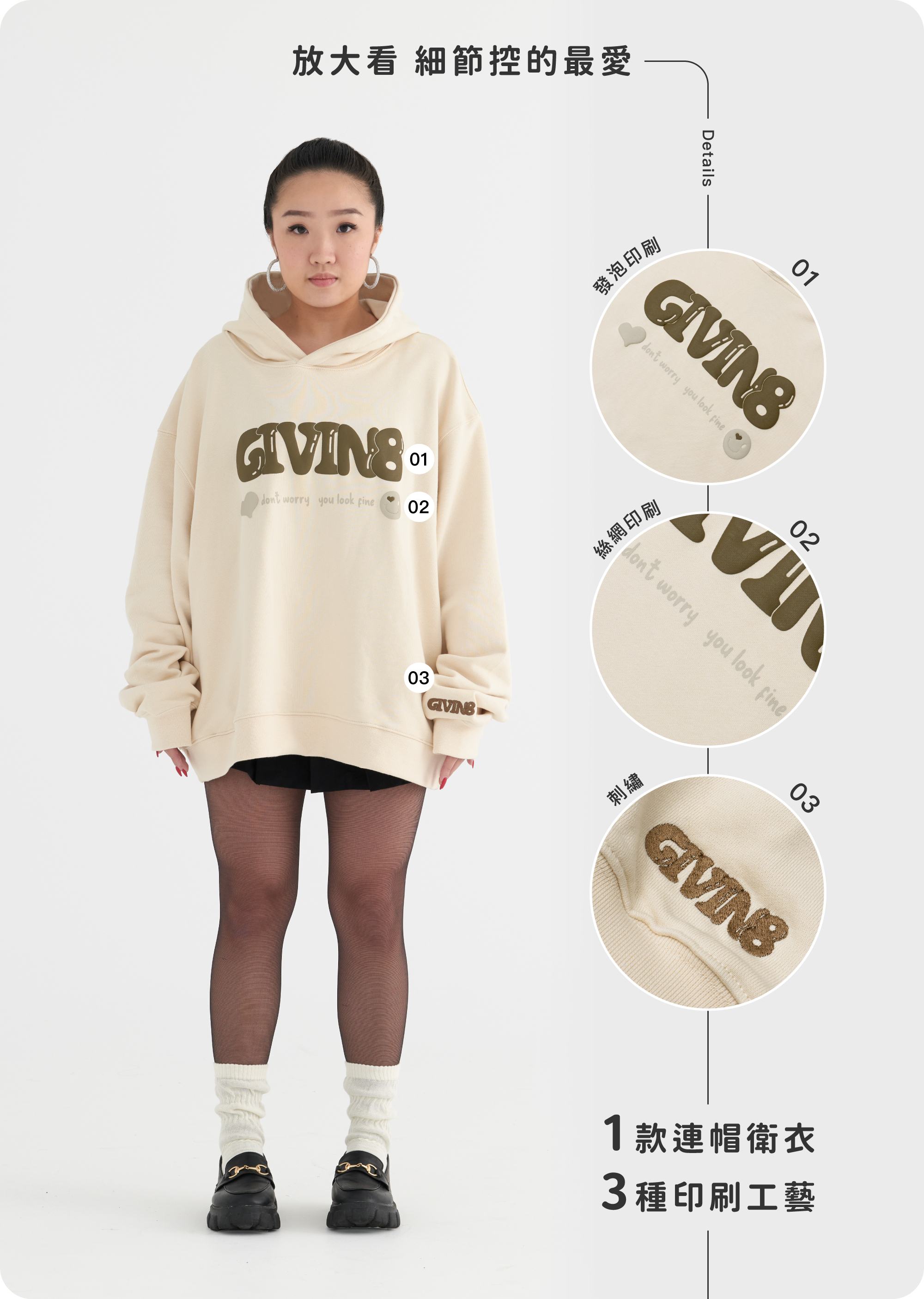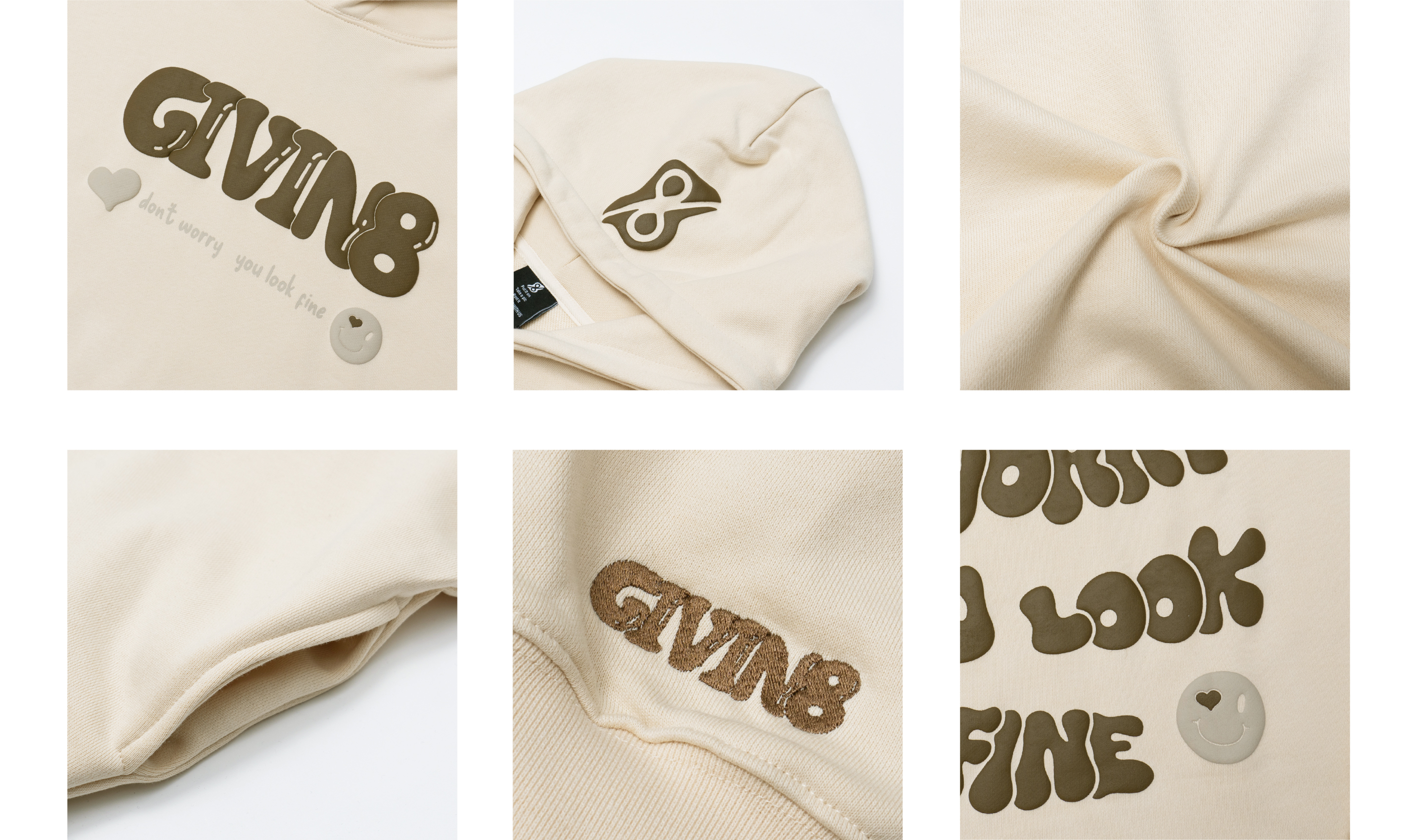 - 正面印刷為「GIVIN8」的LOGO發泡字體,背面印刷為品牌精神延伸出的「"DON'T WORRY, YOU LOOK FINE."」標語,提醒大家每個人都是獨一無二的,不要容貌焦慮。