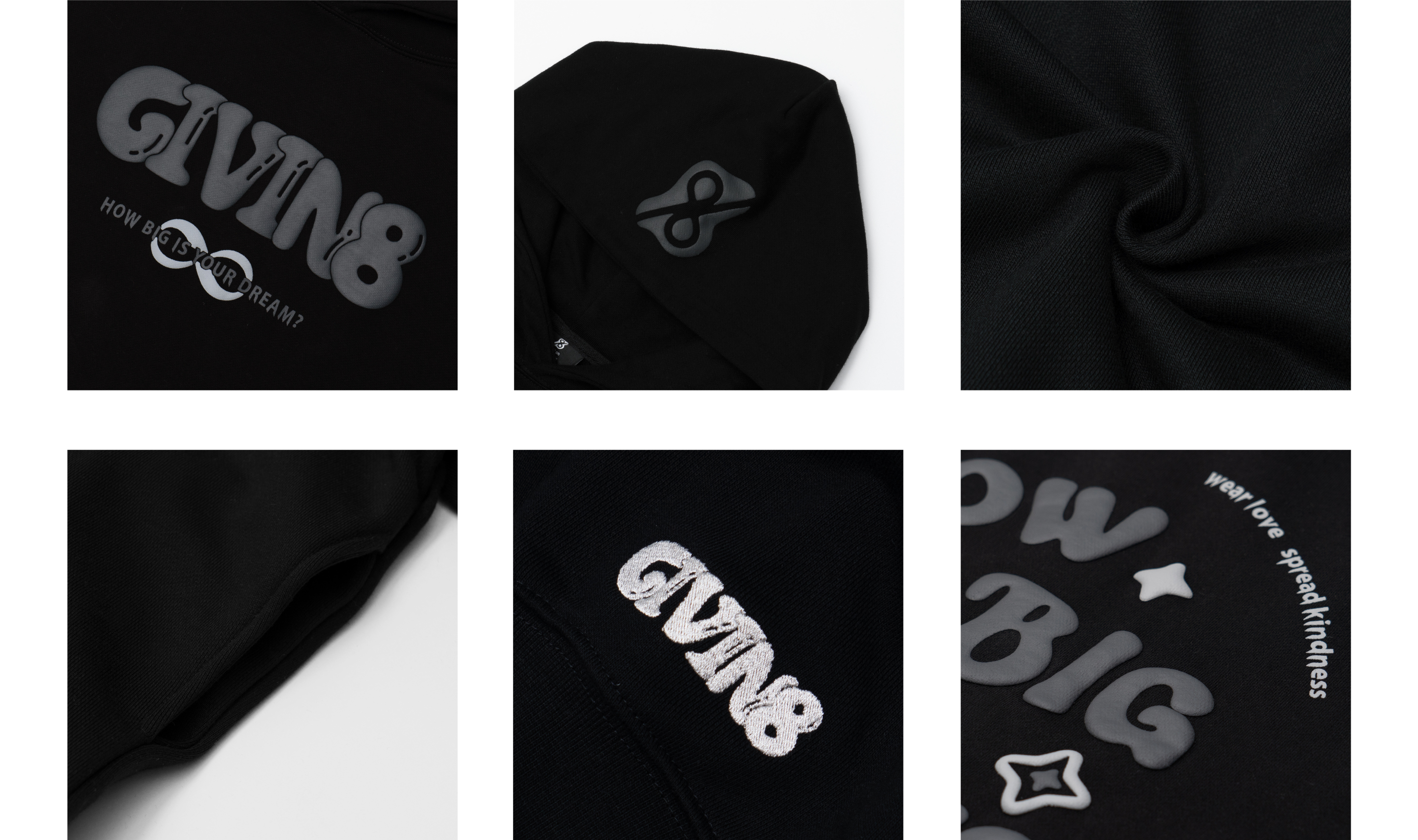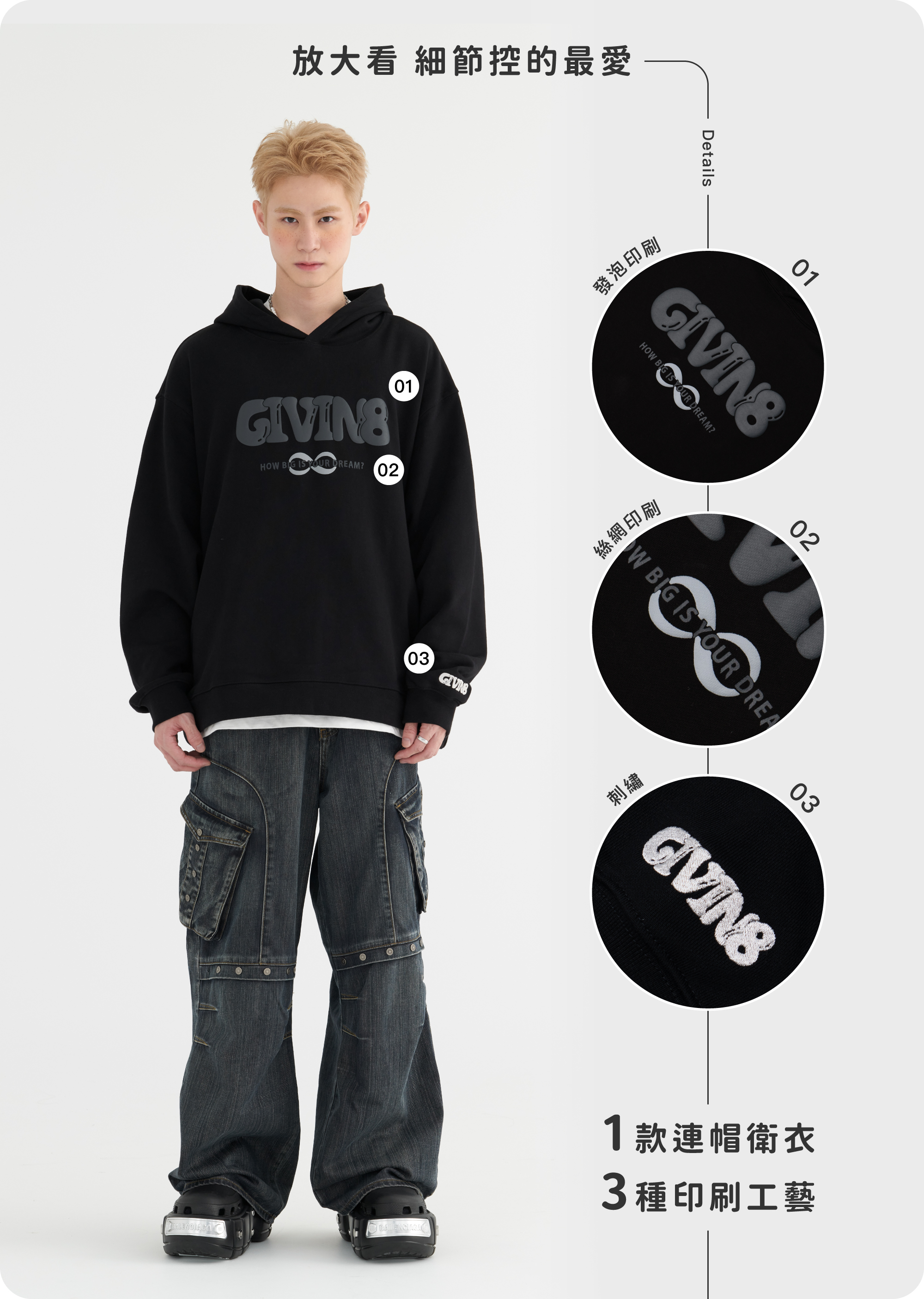 - 正面印刷為「GIVIN8」的LOGO發泡字體,背面印刷為品牌精神延伸出的「"HOW BIG IS YOUR DREAM."」標語,鼓勵大家勇敢追求夢想。