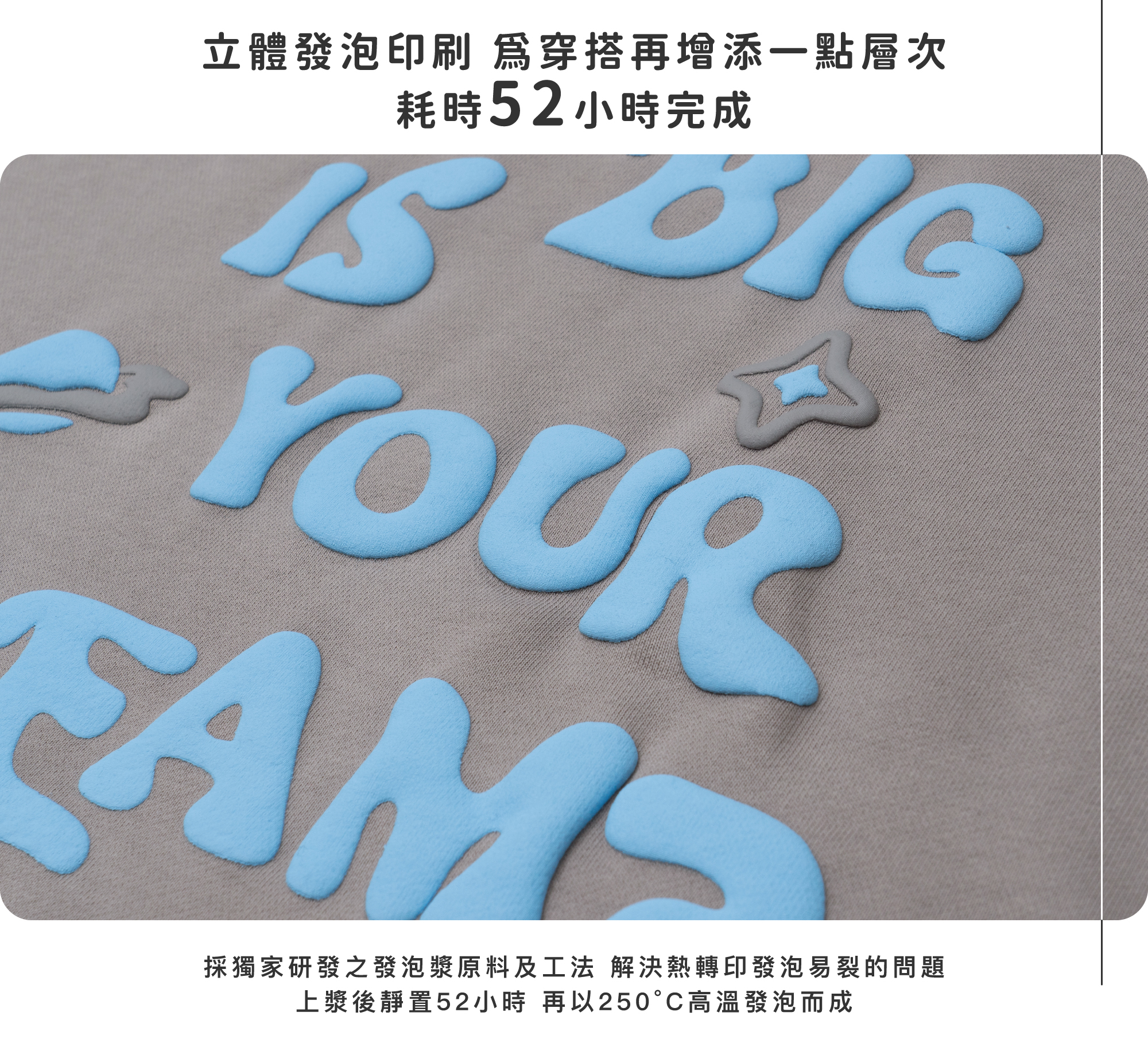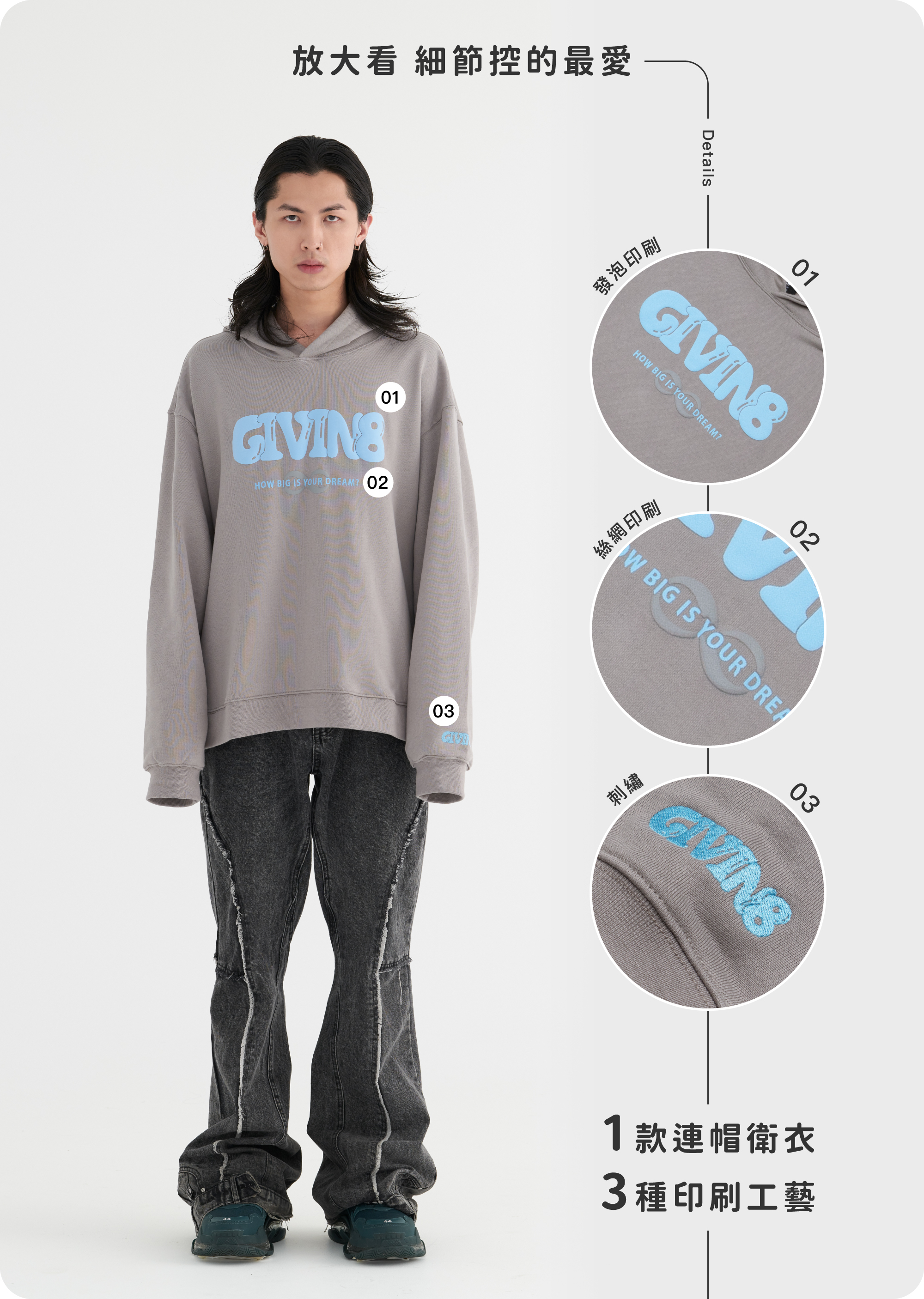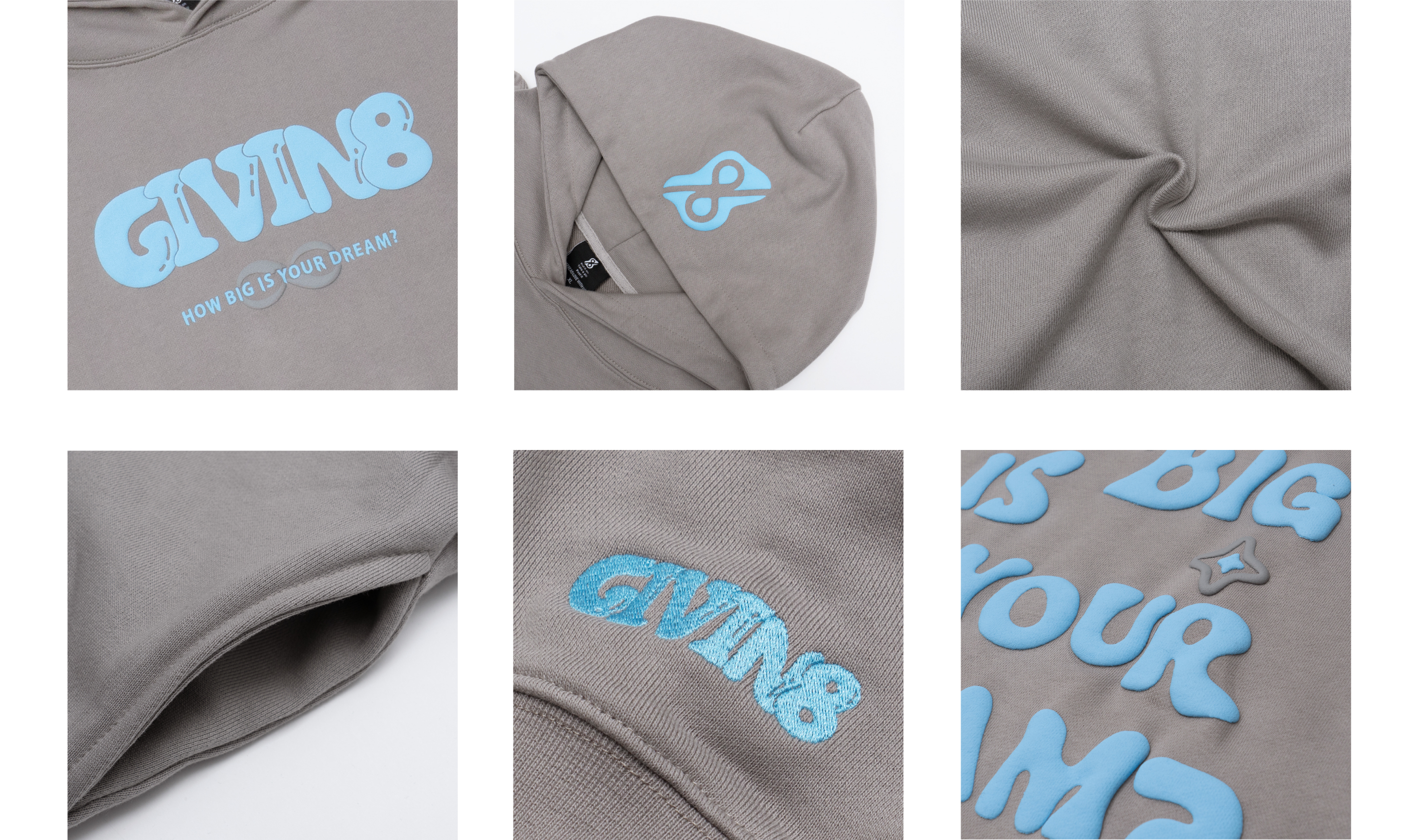 - 正面印刷為「GIVIN8」的LOGO發泡字體,背面印刷為品牌精神延伸出的「"HOW BIG IS YOUR DREAM."」標語,鼓勵大家勇敢追求夢想。
