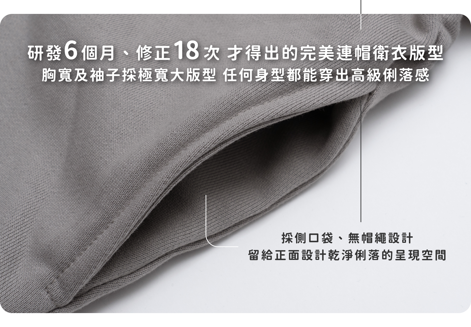 - 無抽繩帽子、側口袋設計,正面乾淨俐落,完美呈現視覺美學。